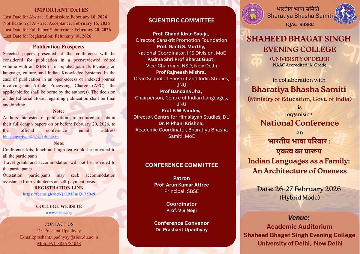 In welcoming you, I bring with me 52 years of celebrated history of this Institution, the exemplary heritage of the University of Delhi and the spirit of our beloved nation. In these years our college has established itself as a reputed institution imparting education in Humanities, Commerce and Social Sciences. In tune with our motto ?Rashtra Devo Bhava? we, at SBSEC, inculcate in our students the value of seeking greater well-being of the society and the nation. This motto which